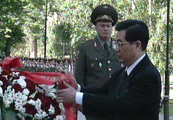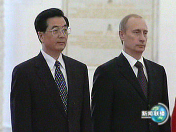 今天是胡錦濤主席訪俄的第二天。當?shù)貢r間今天上午,胡錦濤主席向無名烈士墓敬獻了花圈,并參觀了俯首山衛(wèi)國戰(zhàn)爭博物館。中午,普京總統(tǒng)在克里姆林宮為胡錦濤主席舉行了歡迎儀式并進行小、大范圍會談。會談結束后,兩國元首簽署了中俄聯(lián)合聲明等三個文件。