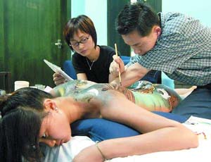 中新網(wǎng)5月30日電 據(jù)信息時報報道,昨天,中國首個人體彩繪展覽作品創(chuàng)作在廣州開筆。本次展覽的作品主要以中國的傳統(tǒng)國畫作品為主,這在中國乃至世界都尚屬首次,同時這也標志著中國人體彩繪藝術(shù)將登上一個新的臺階,不再以西洋藝術(shù)為主導(dǎo),而轉(zhuǎn)向傳統(tǒng)的中國文化創(chuàng)作上。