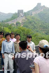 一些外地游客五月三十一日在北京八達(dá)嶺長城上合影,留下美好瞬間。因北京非典疫情而冷清多日的一些著名景點(diǎn)隨著疫情的回落,開始顯現(xiàn)旅游熱升溫跡象。中新社記者:毛建軍