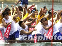 在一日舉行的2003年澳門(mén)國(guó)際龍舟賽澳門(mén)女子公開(kāi)賽中,女選手巾幗不讓須眉,奮勇?tīng)?zhēng)先。 中新社記者 李剛