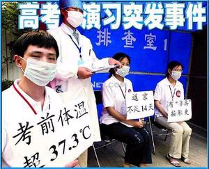 據(jù)北京青年報報道,昨天14點50分,101中學(xué)考點考生開始進入考點。由老師扮演的考生一一走過“驗證處”,老師進行嚴密排查,不久,“忘帶健康卡”、“考前體溫超過37.3攝氏度”、“返京不足14天”、“有‘非典’接觸史”、“健康卡兩章不全”、“忘帶準考證”等各種“問題考生”舉著醒目的標(biāo)牌,在引導(dǎo)老師的帶領(lǐng)下一一被臨時“安置”!皢栴}考生”的問題得到解決后,與其他考生一樣進行體溫測試。進入校門的考生在工作人員的指引下,先在臨時洗手池洗手消毒,然后按照考場示意圖去考場位置。