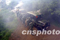 在全面防護下的中國海軍某防化部隊,六月于江南某地進行現(xiàn)代戰(zhàn)法演練,迅速通過“戰(zhàn)地”污染區(qū)。作者:楊波