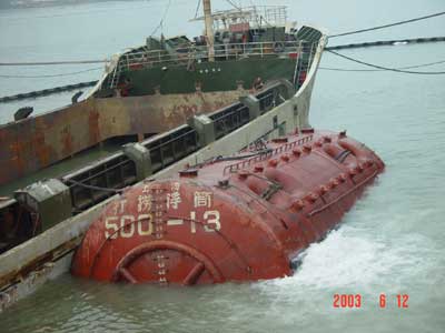 “華頂山”號沉沒后,海事部門決定采取“浮筒打撈法”,也就是將4只浮力總計2000噸的浮筒固定在沉船兩側,然后向浮筒內(nèi)注入壓縮空氣,讓沉船與浮筒一起浮出水面。經(jīng)過救撈人員連續(xù)數(shù)日的緊張調(diào)試安裝,昨天下午,壓縮空氣被注入浮筒,沉默在水中15天的“華頂山”號終于慢慢浮出水面。(劉立忠、王蔚然)