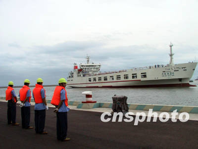 工程人員介紹說:“粵海鐵二號”到達?诤螅瑢⒃诃傊莺{粵海鐵路南、北港口之間進行船、橋、港聯(lián)合調試,在滿足調試大綱的各項技術指標要求并辦理交船和運營手續(xù)后,與“粵海鐵一號”實現(xiàn)對開,一旦汽車運輸、火車客運獲批,將同時投入運營。