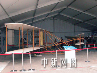 離博物館幾步路之遠的一個人字型展棚里,陳列著一九零三年十二月十七日懷特兄弟駕上天的那架簡陋飛機的復制品,懷特兄弟短短五十九秒的空中飛行,揭開了人類征服地球引力的光輝篇章。