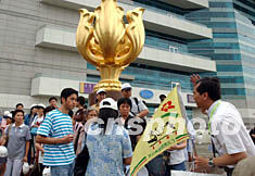 廣之旅三百人大型旅游團六月十四日在香港金紫荊廣場拉開香港游序幕,使該旅游景點人氣重現(xiàn)。潘索菲 攝
