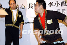 為紀念國際巨星李小龍逝世三十周年,六月十四日香港舉行「龍的心、共抗炎,李小龍慈善珍藏電話卡公開發(fā)行」活動。圖為李小龍弟子為賓客演示雙節(jié)棍。錢興強 攝