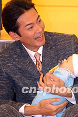 香港藝員江華,六月十五日在香港時代廣場舉行的歡度父親節(jié)活動上,風(fēng)趣示范抱BB做運動一分鍾。錢興強 攝