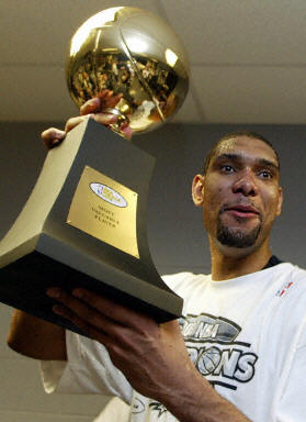 這也是馬刺隊史上第二座總冠軍,鄧肯獲選最有價值球員(MVP)。鄧肯毫無意外拿下決賽最有價值球員獎,他在這個系列戰(zhàn)中,平均攻下二十四點二分,抓下十七個籃板,送出五點三次助攻以及五點三次阻攻,其中季后賽總阻攻數(shù)一百三十一次,刷新NBA季后賽紀錄,而今天單場八次阻攻,也追平了總冠軍賽單場阻攻紀錄。