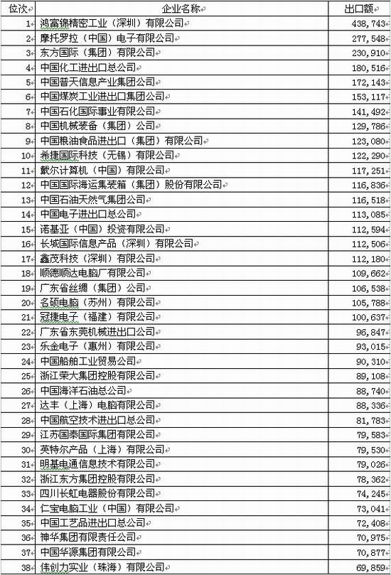鴻富錦精密工業(yè)(深圳)有限公司出口額達(dá)43.9億美元,增長(zhǎng)115.9%,列200家之首;摩托羅拉(中國(guó))電子有限公司出口27.8億美元,增長(zhǎng)72.1%,排名由上年的第7位上升到第2位。鴻富錦精密工業(yè)(深圳)有限公司和摩托羅拉(中國(guó))電子有限公司還分別以進(jìn)出口79.2億美元和53.9億美元列進(jìn)出口額最大的500家企業(yè)的第2和第4位。