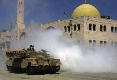 6月17日,在約旦河西岸納布盧斯附近的阿斯卡爾難民營(yíng)里,一輛以色列坦克在一座清真寺前駛過。在當(dāng)天這一地區(qū)發(fā)生的巴以沖突中,以色列軍隊(duì)開槍打傷兩名巴勒斯坦人。