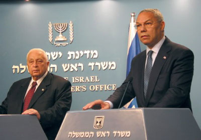 鮑威爾在會(huì)晤后與沙龍舉行的聯(lián)合記者招待會(huì)上表示,巴勒斯坦方面不能僅僅通過與巴激進(jìn)組織達(dá)成;饏f(xié)議來停止暴力活動(dòng),而應(yīng)該摧毀他們制造暴力的能力。鮑威爾還指責(zé)巴勒斯坦伊斯蘭抵抗運(yùn)動(dòng)(哈馬斯)是“和平的敵人”。