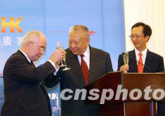 香港特首董建華、財政司長梁錦松及投資推廣署長盧維思,6月24日在禮賓府特設酒會,舉杯祝賀來港投資的中外企業(yè)代表在港開業(yè)擴充業(yè)務。 中新社記者 洪少葵