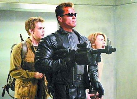 《終結(jié)者3》7月2日上映,這之前有記者采訪了男主角施瓦辛格,見到他時(shí),他正在和他四歲的兒子克里斯多佛在飯桌上玩國際象棋。當(dāng)時(shí)施瓦辛格在棋局中處于劣勢,看到我們,他干脆將木質(zhì)棋盤放到一邊,并搬來幾張椅子,還派發(fā)飲料,很開心地接受采訪。在他舒服地坐在凳上的時(shí)候,卡其布短褲下膝蓋上的疤痕清晰可見。在整個(gè)采訪的過程中,克里斯多佛會(huì)不時(shí)地爬到他爸爸身上扯他的耳朵,不過施瓦辛格也不在意,繼續(xù)我們的談話,談他拍《終結(jié)者3》的事情。談話中,施瓦辛格說:“我曾說過,我會(huì)回來的,現(xiàn)在,我回來了!辈稍L最后,他還強(qiáng)調(diào)“有人說我老了,我會(huì)證明給他們看,我像20年前一樣棒。”