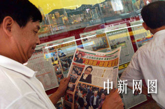 香港媒體關(guān)注國務(wù)院總理溫家寶訪港。香港媒體關(guān)注中國國務(wù)院總理溫家寶訪港,29日?qǐng)?bào)刊雜志頭條刊登新聞,市民駐足瀏覽。中新社記者洪少葵攝