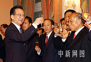 六月二十九日,國務院總理溫家寶在香港見證“內地與香港更緊密經貿關系安排”簽字儀式,圖為溫家寶在簽字儀式上向香港知名人士祝酒。中新社記者 潘索菲 攝