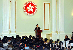 六月二十九日,國務院總理溫家寶在香港禮賓府發(fā)表講話,并強調中央政府毫不動搖支持一國兩制。中新社記者 潘索菲 攝