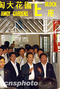 六月三十日,國(guó)務(wù)院總理溫家寶訪問(wèn)香港社區(qū)淘大花園。淘大花園曾為SARS重災(zāi)區(qū)。中新社記者 潘索菲 攝