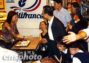 六月三十日,國(guó)務(wù)院總理溫家寶在香港新城市廣場(chǎng)參觀,圖為他在快餐店與市民交談。中新社記者 潘索菲 攝