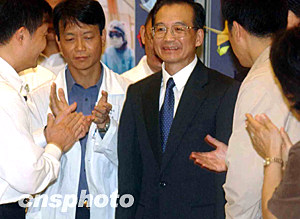 國務院總理溫家寶六月三十日到首先爆發(fā)非典型肺炎的沙田威爾斯親王醫(yī)院視察,溫家寶一到場就逐一同醫(yī)護人員握手,說:辛苦你們了。中新社記者 錢興強 攝