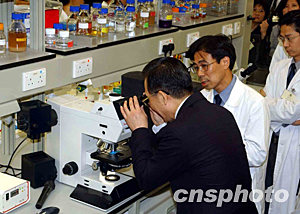 六月三十日,國務(wù)院總理溫家寶參觀香港大學(xué)基因中心,圖為溫總理使用顯微鏡。中新社記者 潘索菲 攝