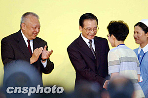 國務(wù)院總理溫家寶6月30日出席表揚醫(yī)護人員成功抗炎大會,向在抗擊SARS中以身殉職的醫(yī)護人員家屬表示慰問。洪少葵 攝