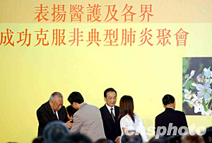 國務(wù)院總理溫家寶6月30日在香港表揚醫(yī)護人員成功克服SARS聚會上,表彰醫(yī)護界、科研界、志愿機構(gòu)、政府部門和學(xué)校的代表,并慰問因公殉職的謝婉雯醫(yī)生、護士劉永佳等家人。洪少葵 攝