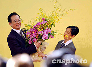 國務(wù)院總理溫家寶6月30日在香港出席表揚醫(yī)護人員成功抗炎大會時,接受醫(yī)護人員獻花,總理溫家寶隨即將花轉(zhuǎn)送在抗擊SARS中殉職的醫(yī)護人員家屬時,受到在場人士的陣陣掌聲。洪少葵 攝