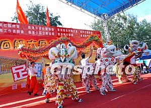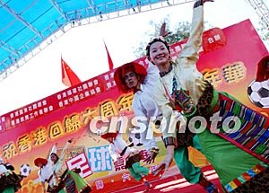為慶祝香港回歸祖國六周年,香港十個團(tuán)體合作籌辦的“慶;貧w祖國六周年足球嘉年華”一連三天在維園舉行。圖為7月1日典禮儀式上龍獅起舞,歡慶佳節(jié)。洪少葵 攝