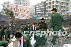 四日,數(shù)百名武警冒著酷暑進(jìn)行上海軌道交通4號線滲水事故搶險,一度被黃浦江潮水沖出缺口的堤壩已經(jīng)得以加固。作者:湯彥俊