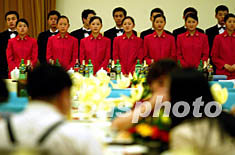 四日晚,整裝待命的侍應(yīng)生在人民大會堂金色大廳內(nèi)迎候來京旅游的香港和韓國、澳大利亞的549名游客。北京旅游局從即日起將陸續(xù)在大會堂宴請北京“雙解除”后的境內(nèi)外游客。中新社記者 鄭萍萍 攝