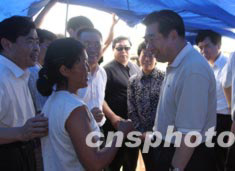 七月五日,國務(wù)院副總理回良玉來到安徽阜陽王家壩,看望安全轉(zhuǎn)移到大堤上的受災(zāi)群眾.中新社記者:盛佳鵬