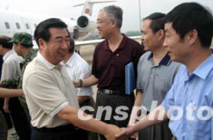 七月五日,國務(wù)院副總理回良玉乘專機抵達(dá)安徽阜陽機場,前往淮河抗洪前線,看望受災(zāi)群眾,查看災(zāi)情。中新社記者:盛佳鵬
