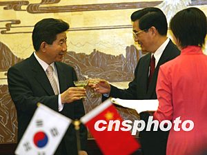 中國國家主席胡錦濤與韓國總統(tǒng)盧武鉉七日在北京共同出席雙方多個(gè)合作協(xié)議的簽字儀式。中新社記者:滿會(huì)喬