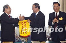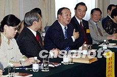 2008年北京奧運會組委會副主席蔣效愚7月8日在北京會見以馮滬祥(右一)為團(tuán)長、郭俊次(右三)為名譽(yù)團(tuán)長的臺灣中華教授協(xié)會大陸參訪團(tuán)成員,并向他們介紹申奧過程和二零零八年北京奧運會的準(zhǔn)備情況。中新社記者:毛建軍