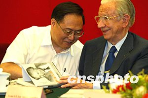 薩馬蘭奇為出席首發(fā)式的中國人民解放軍副總參謀長熊光楷在新書上簽名。中新社記者:毛建軍