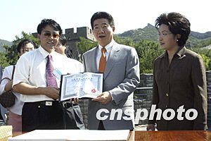 盧武鉉與夫人登上北京八達(dá)嶺長(zhǎng)城,并獲得登城證書(shū)。中新社記者:毛建軍  盧武鉉與夫人登上北京八達(dá)嶺長(zhǎng)城,觀看獲贈(zèng)的城磚復(fù)制品。中新社記者:毛建軍