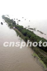 七月十四日,由于晴天及第二次洪峰的順利通過,淮河安徽淮南段水位下降,曾幾乎被淹沒的堤壩在洪水下降時逐漸露出真面目。中新社記者:盛佳鵬
