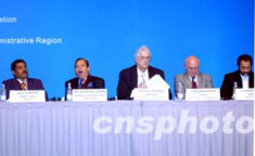 2003年7月14日在香港舉行的“重振亞洲旅游業(yè)會(huì)議”全體大會(huì)上,[左起]瓦努阿圖旅游部長(zhǎng)Jean Alain Mahe、孟加拉國(guó)國(guó)民用航空和旅游部長(zhǎng)Mir Mohammad Nasir Uddin、加拿大旅游委員會(huì)副總裁Thomas Penney、世界旅游旅行委員會(huì)主席鮑姆加騰、伊朗駐華大使Fereydoun Verdinejad等嘉賓出席會(huì)議并發(fā)表專(zhuān)題演講。中新社記者:洪少葵