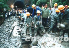 7月13日,位于陜西省西部的寶雞地區(qū)大雨滂沱,致使寶成鐵路寶雞境內(nèi)的觀音山車站南約500米處發(fā)生險(xiǎn)情,一處隧道被堵住,并有多處路基被沖跨。西安鐵路工程集團(tuán)公司等單位千余名員工和武警官兵及當(dāng)?shù)厝罕妸^力搶險(xiǎn),使寶成鐵路在14日上午恢復(fù)通車。作者:霍倪