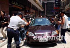 香港大批新聞記者,7月16日聚集在英皇集團總部,追訪商人楊受成涉案到廉署助查事件。中新社記者:洪少葵