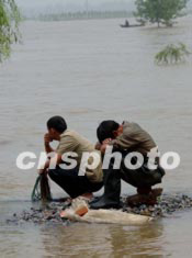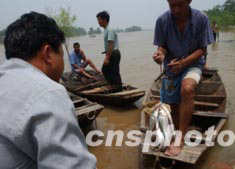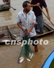 今夏淮河洪水淹沒千里漁米之鄉(xiāng)的魚塘,養(yǎng)魚農(nóng)民血本無歸。安徽省阜陽縣王家壩的漁民和村民目前抓緊撒網(wǎng)捕撈流失之魚,略補(bǔ)生活損失。中新社記者:賈國榮