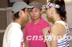 歌星黃伊汶、梁奕倫、范振鋒(右起)7月18日出席香港電臺(tái)節(jié)目《娛樂滿天星》訪問,三人同屬環(huán)球唱片公司,節(jié)目未開始時(shí)聚首交頭接耳了解事情最新動(dòng)態(tài)。中新社記者:鄧慶樂