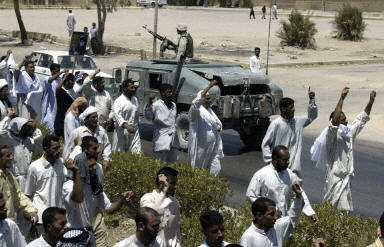 示威者在納杰夫市內(nèi)一主要清真寺門前集合,步行到由美國(guó)海軍陸戰(zhàn)隊(duì)把守的市政廳門前,并高呼“不要美國(guó)”等口號(hào)。有些憤怒的伊拉克人還向美國(guó)士兵投擲石塊,美軍沒(méi)有開槍還擊。