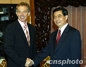 中國國家主席胡錦濤二十一日在北京會(huì)見英國首相布萊爾。中新社記者:滿會(huì)喬