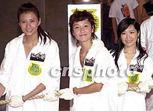 歌星黃伊汶、陳文媛、關(guān)心妍7月22日在香港出席商業(yè)電臺(tái)活動(dòng)《03之夏903給你一個(gè)星級(jí)會(huì)所·仙樂都》記者會(huì),她們組成的歌星隊(duì)與商臺(tái)DJ進(jìn)行拔河較量,勝出后展現(xiàn)笑容。作者:鄧慶樂