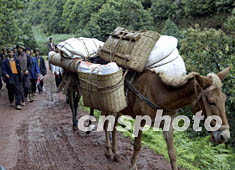 大批來自政府和社會各界的救災(zāi)物資二十三日抵達(dá)云南省大姚縣地震災(zāi)區(qū),馬幫為地處大山深處的震中災(zāi)區(qū)運(yùn)送生活必需品等救災(zāi)物資。中新社記者:毛建軍