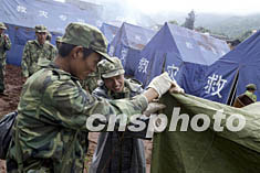 數(shù)百名解放軍官兵二十三日在云南省大姚縣曇華鄉(xiāng)地震災(zāi)區(qū)為災(zāi)民搭建帳篷,幫助當(dāng)?shù)厥転?zāi)民眾抗震救災(zāi)。中新社記者:毛建軍