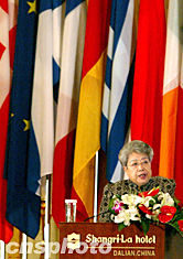 中國國務(wù)院副總理吳儀七月二十四日在大連出席第五屆亞歐經(jīng)濟(jì)部長會議開幕式。中新社記者:鄭萍萍