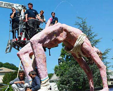 中新網(wǎng)7月26日電 英國王子查爾斯即將抵達(dá)奧地利城市薩爾茲堡參加藝術(shù)節(jié)的前一天晚上,人們?yōu)橐蛔鹁扌偷哪凶铀芟衽e行了揭幕儀式。但是,幕布揭去之后,人們居然看到這尊塑像的陰莖竟然長達(dá)兩英尺。這一奇觀立刻在市民們當(dāng)中引起了激烈的爭論。